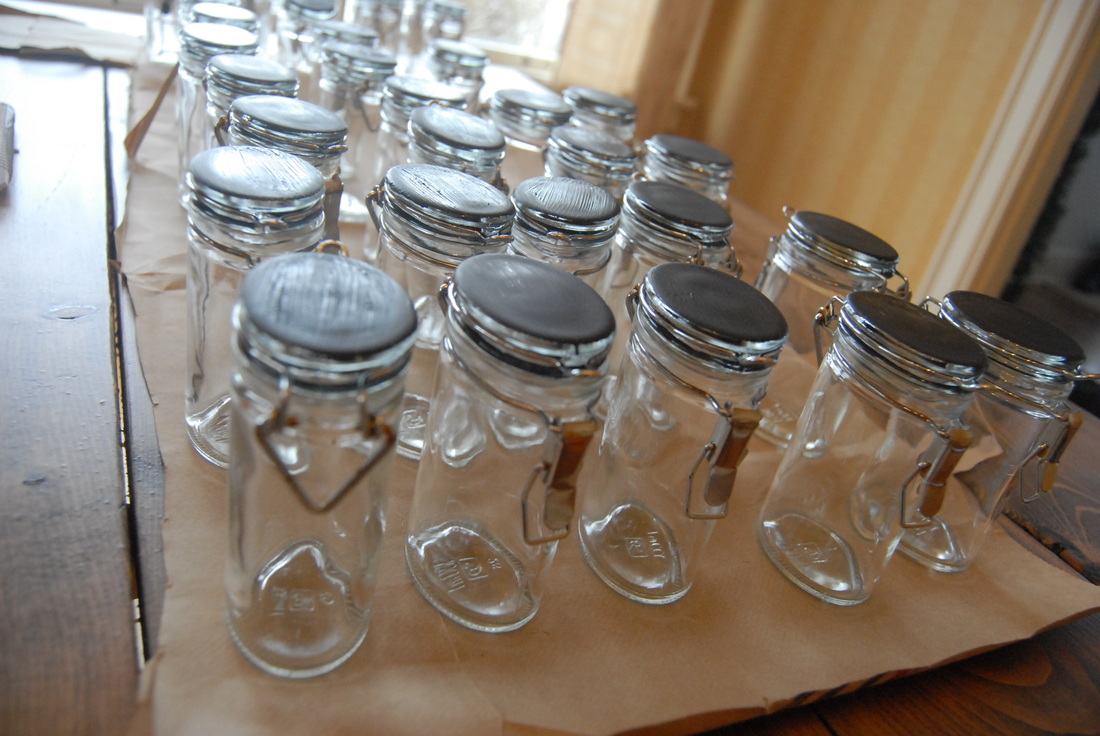 Instructions: Here is the process I went through to make this... I started by washing all of the jars. After they were dry I removed the rubber seals and set them to the side to avoid getting paint on them. Using the recipe I found on Attempting Aloha, I mixed the chalkboard paint. The ratio is about 2 ounces (1/4 cup) Acrylic paint to 1.5 teaspoons of non-sanded grout. Be careful because the grout is very dusty! The paint does come out really thick. You can add a little more acrylic paint to the mix if needed but it does smooth out when applied to the jars. I applied two coats of paint to the lids of each jar, waiting for them to dry in between coats. After the second coat was dry, I wrote the spice names on the tops of the jars with the wet erase chalk marker. I also wrote the expiration date on the bottom of the jars using a sharpie. I put the rubber seal back on the jar and poured the spices in. Then they were ready for there new home next to all the Nuun! I was really excited to have space freed up in the cabinet. Don’t worry it didn’t take me long to fill it up with something else. 1 Comment | About us...Married August 6, 2011 bought our first house October 1, 2011. ArchivesMarch 2012 CategoriesAll Links monetized by VigLink