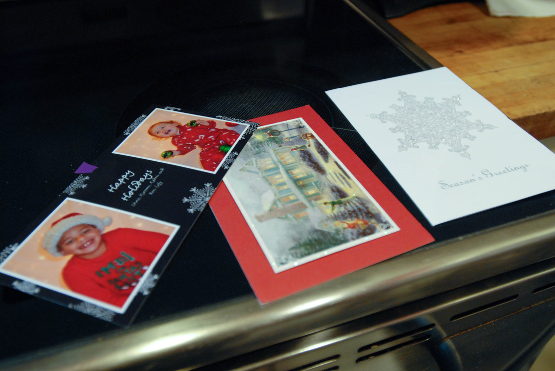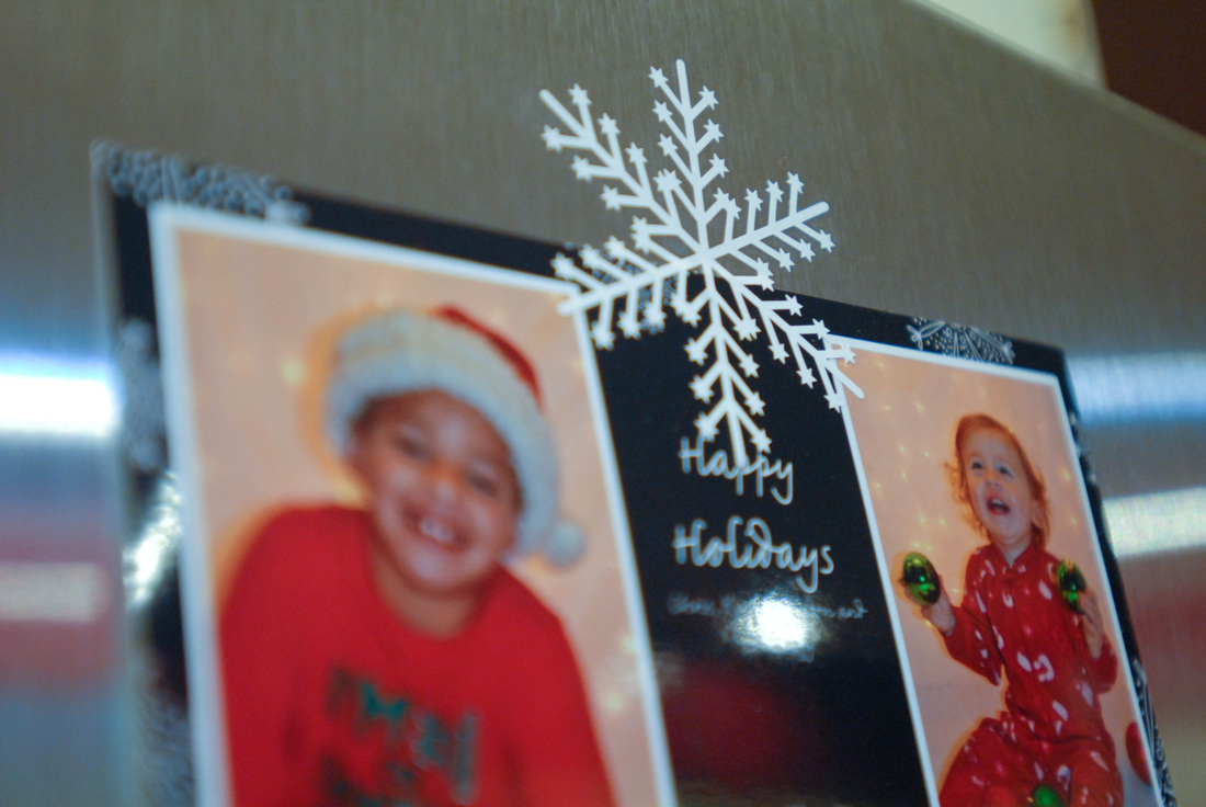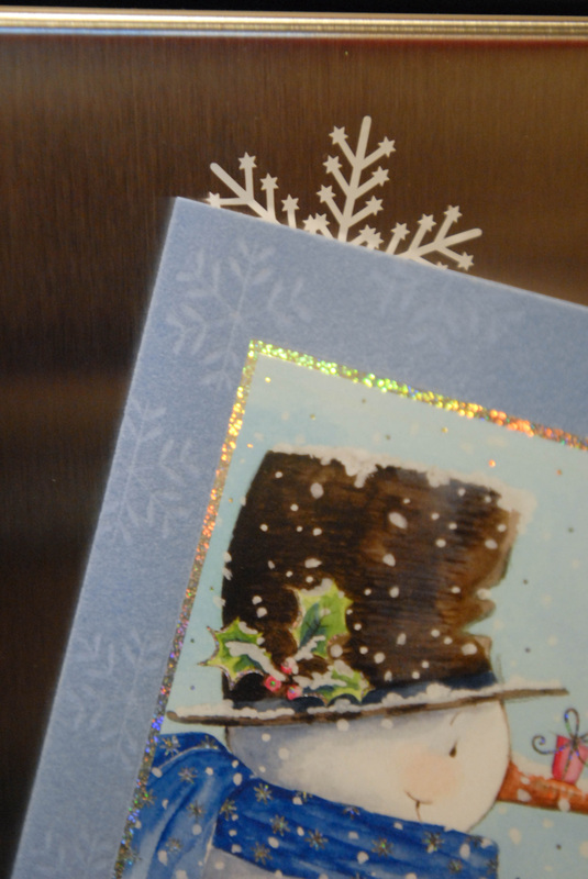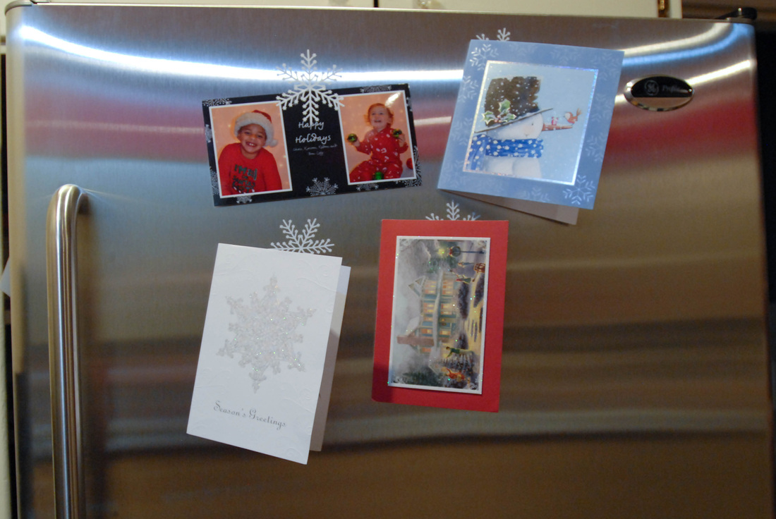 We just started getting holiday card in the mail this week and have been in the hunt for a good spot to display them. I found it! I used some leftover vinyl from another Christmas gift and made some really cute snowflake stickers to hang them on our non-magnetic front of refrigerator.