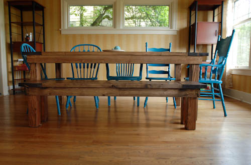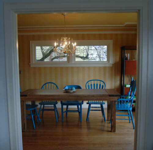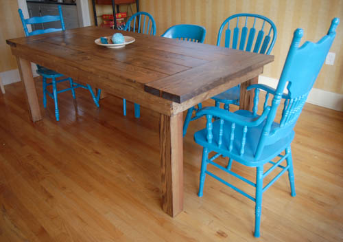 Nothing looks homier than mismatched chairs around a farmhouse table.  As soon as we started building our farmhouse table we started making trips to thrift stores to find the perfect chairs. We had a goal to find five random style chairs to go around three sides of our table; the forth side will have a bench when it is complete.