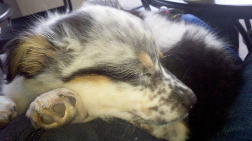 After reading tons of information on the internet we decided to start clicker training Zoey. She is picking up on commands really quick! As of today she can sit on command and is about at 50% on shake and touch. Not bad for two days of training and only being 8 weeks old. I think we have a smart one!