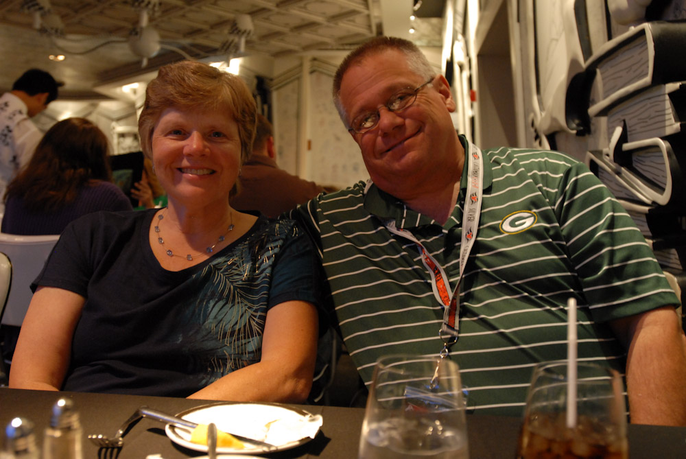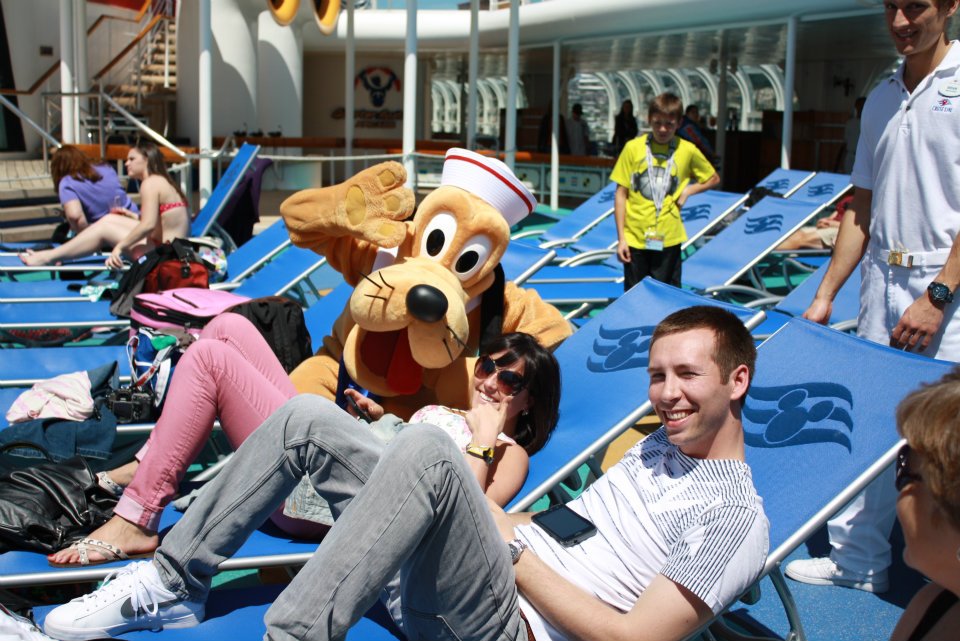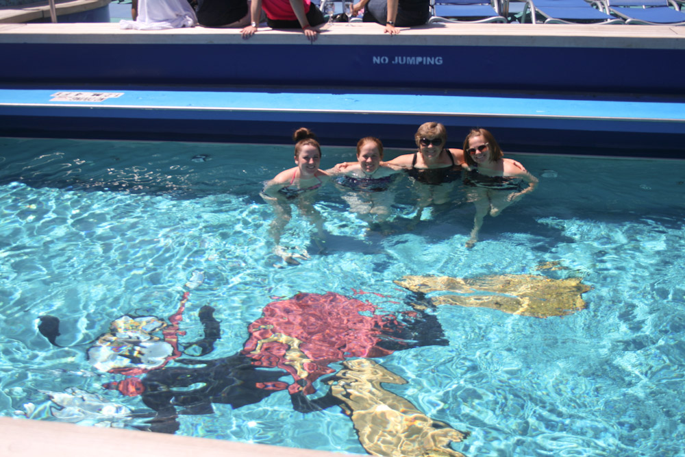 The Disney Wonder added a glass window to the front of the boat to help block the wind. Katie in front with April behind the window.