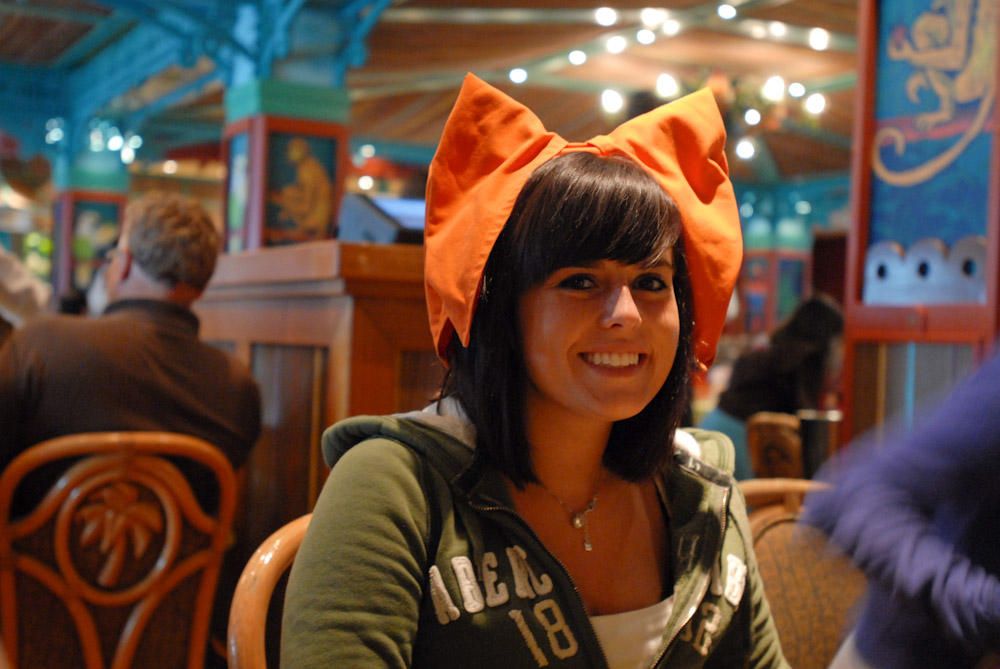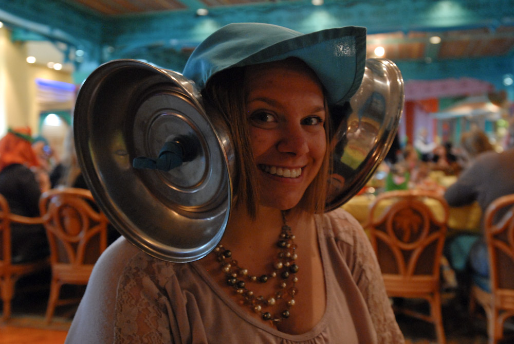 The waiters also entertain by folding dinner napkins into fun hats for everyone at the table. People all over the dining room were being transformed into characters like Dumbo, Rapunzel, Minnie mouse, and goofy.