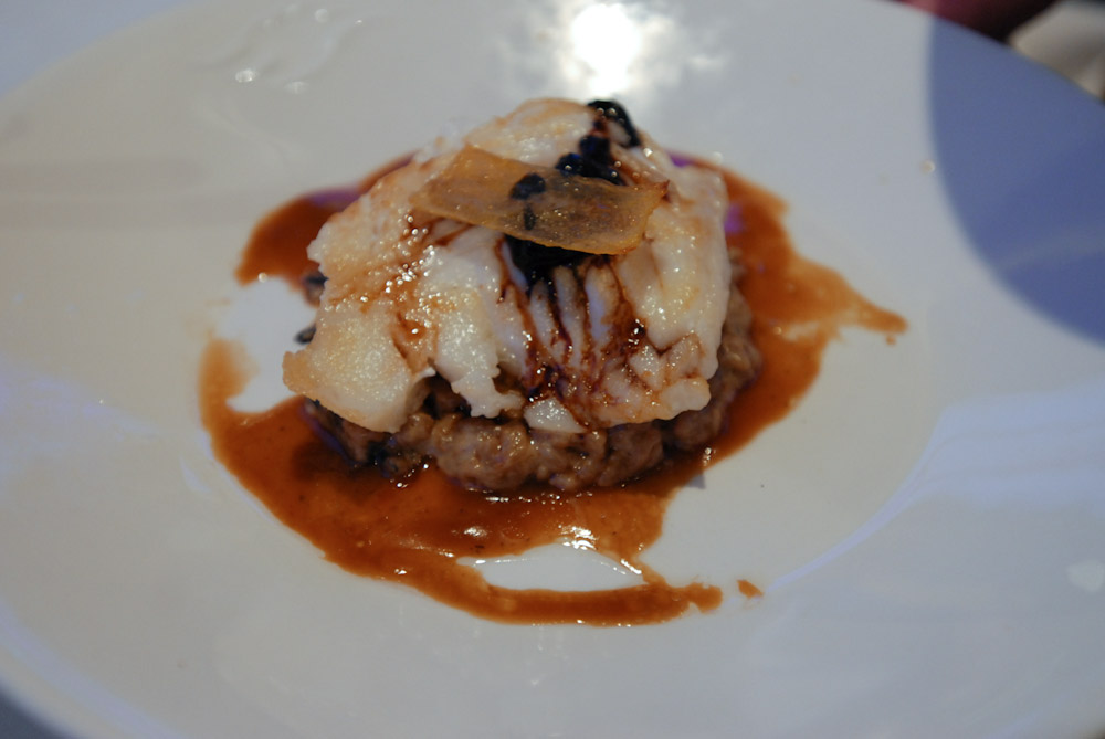 Appetizer: Sesame-flavored Rock Shrimp and Caramelized Onion Cheesecake